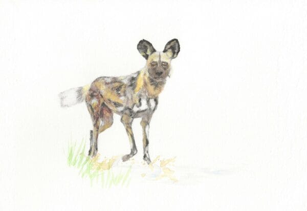 Printed from Silvana Olivo’s original watercolour, the African wild dog (Lycaon pictus), or painted dog, is one of the most endangered mammals on the planet, with about 6600 individuals left in the wild. They are found only in some Southern African countries. Wild dogs live in large packs and, when hunting, can run as fast as greyhounds. They have been ruthlessly killed by farmers to protect their livestock, and their habitat has become too fragmented to guarantee survival from epidemic diseases.