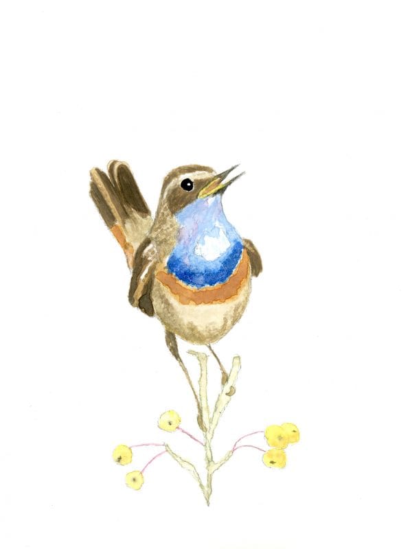 Printed from the original watercolor by Silvana Olivo, the Bluethroat (Luscinia svecica) is captured here with its spring nuptial colours. It is shy and capable of imitating the calls of many other species. This bird is highly endangered in the vibrant countryside of Eastern France, especially Burgundy and Alsace.