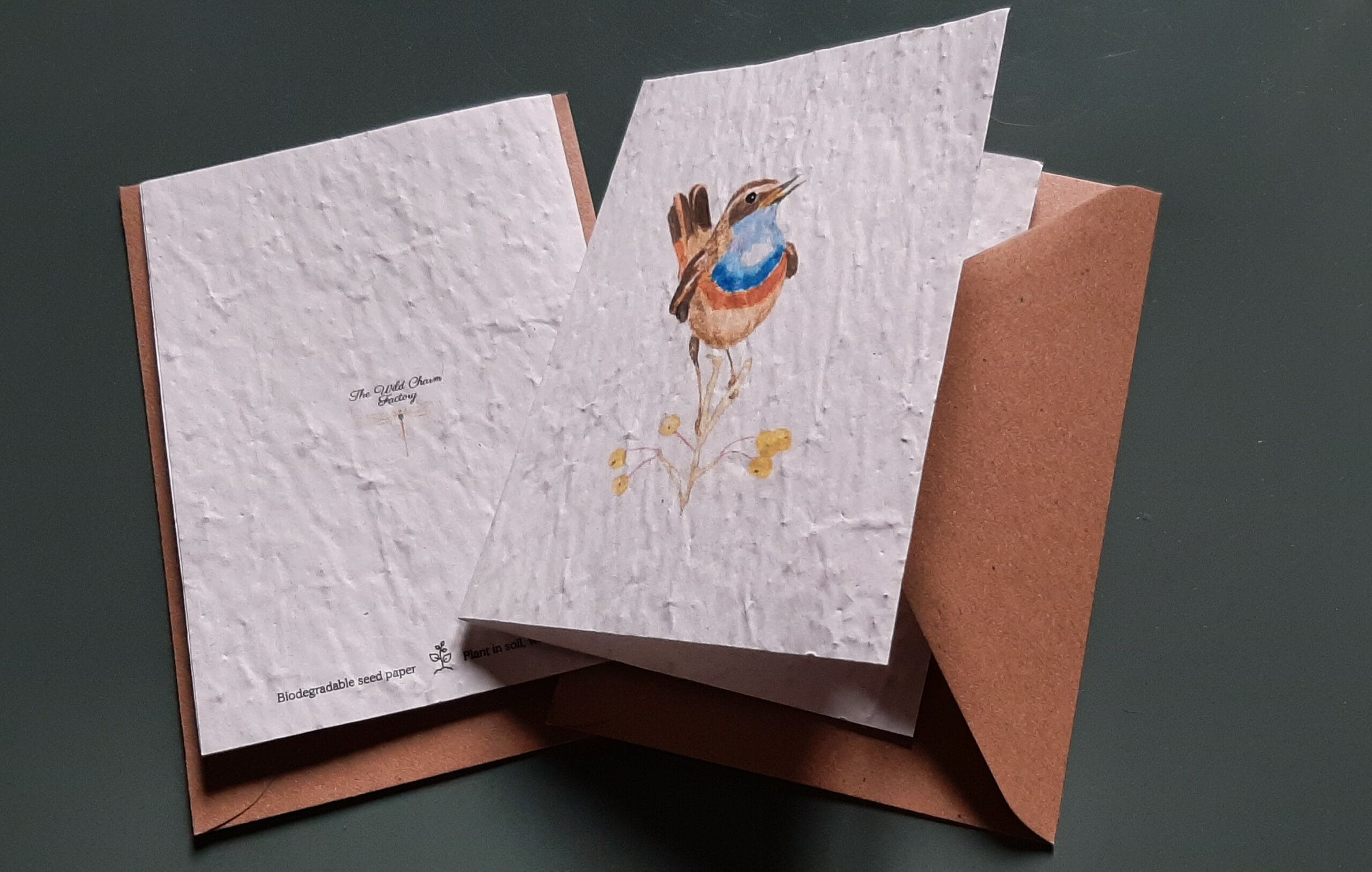 A6 folded card in biodegradable seed paper (wildflowers), with kraft envelope. Printed from the original watercolor by Silvana Olivo, the Bluethroat (Luscinia svecica) is captured here with its spring nuptial colours.